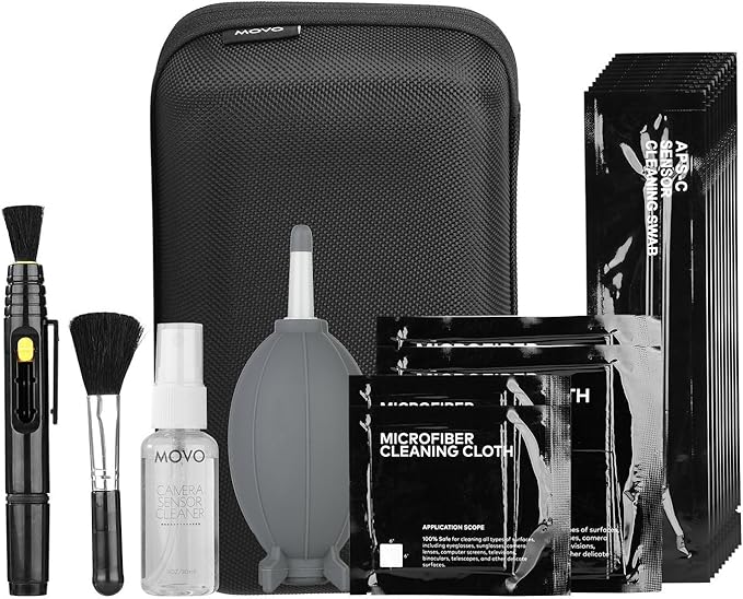 Kit de limpeza de câmera DSLR Movo Deluxe Essentials com 10 cotonetes de limpeza APS-C, fluido de limpeza de sensor, soprador de ar de foguete, caneta de lente, escova macia, 2x panos de microfibra pequenos e 2x grandes e estojo de transporte