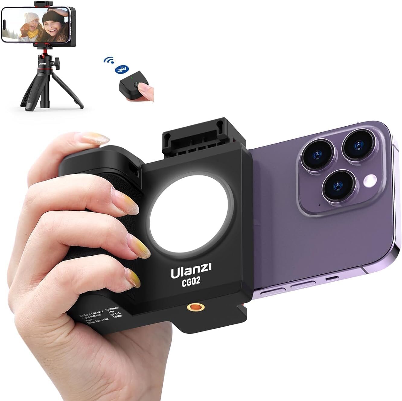 ULANZI CG02 Punho da Alça do Obturador da Câmera do Smartphone sem Graduação com Controle Remoto Sem Fio Bluetooth Destacável, Luz de Preenchimento de Três Engrenagens Ajustável para iPhone Samsung