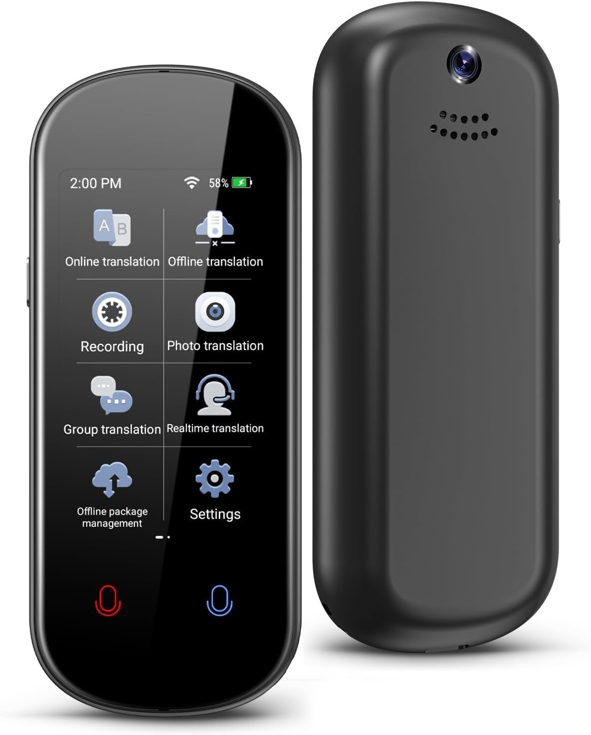 Tradução de imagem de alta definição e redução avançada de ruído: o tradutor bidirecional em tempo real tem uma câmera de alta definição de 5 megapixels integrada, suporta tradução de fotos online em até 74 idiomas e também suporta 40 traduções de fotos offline. Reconhece texto manuscrito, arquivos, menus, placas de trânsito e etiquetas. Você pode entender o texto de acordo com uma foto. O microfone de redução de ruído duplo e as configurações avançadas do alto-falante garantem reconhecimento e reprodução de voz de alta precisão.